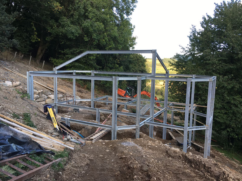 We excavated and installed all utilities, including water, electric, drains, gas and data for a luxury holiday let raised on stilts on a hillside. We constructed and erected a water tower for a sprinkler system, and installed multiple tanks to pump the water from the mains water supply to the property. We installed a 10 person septic tank and drainage field. We excavated for foundations to install steel work to hold the cabin on stilts on a sloping field. We formed a road and hammerhead turning space, and carried out all landscaping around the property. We supplied and installed boulders to retain soil to create disabled access.