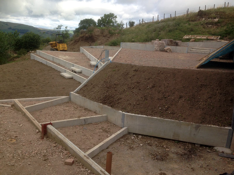 Fairview is a grand design property nestled on a hillside. We were commissioned to demolish the existing bungalow, clear the site, excavate for foundations for the new build, and landscape with concrete panels to create triangular terraced areas. We installed water, a water harvesting tank, electric and data, and a new septic tank with drop chamber manholes, to the new property.