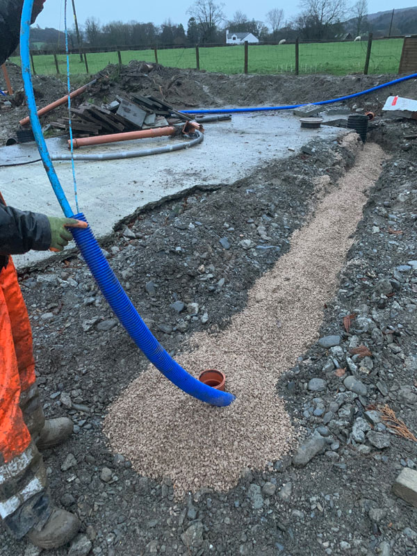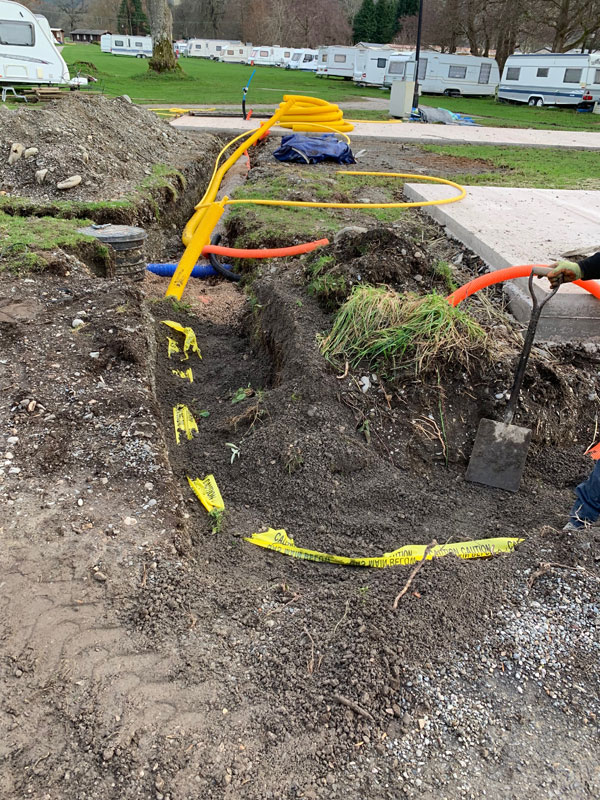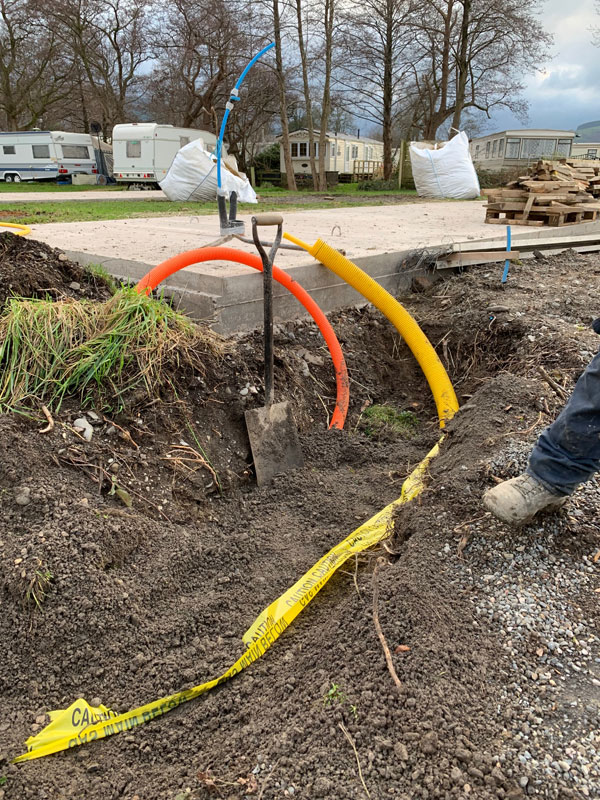 We have carried out extensive groundworks to upgrade the services at a popular caravan park in Llandrillo. We excavated and installed a new mains sewer down the centre of the park, with manholes spurred off in preparation for new static caravan bases. We excavated and installed ducts for electric, gas, data and a new water main. We excavated and installed concrete bases to site the new static caravans.