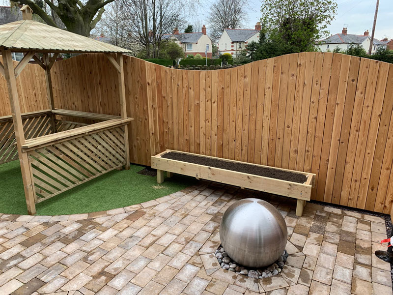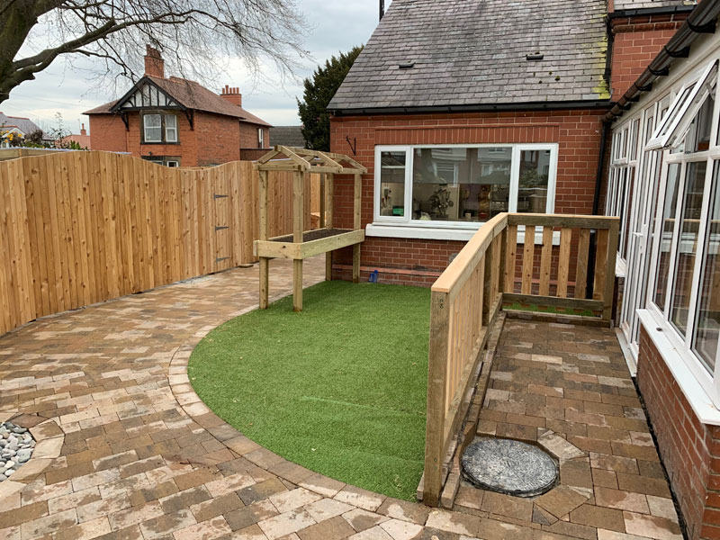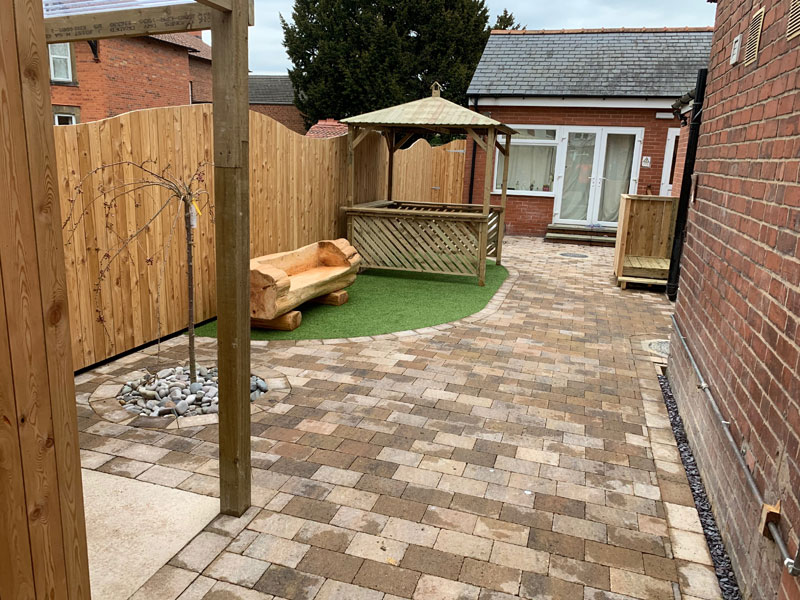 We were given a brief by Hollybank to design a safe, user friendly sensory garden for use by elderly residents with dementia. The site was cleared of all concrete steps, uneven paving slabs and the garden was landscaped so as not to have any steps or steep gradients. We block paved a meandering path and laid astro-turf to create aesthetically pleasing garden for the residents. We installed larch fencing with a wavy top, and a sensory table top and wall mounted panels to create a stimulating visual and touch feature. We made bespoke raised bed planters which could be planted by residents from their wheelchairs. We sourced and installed a unique log bench.